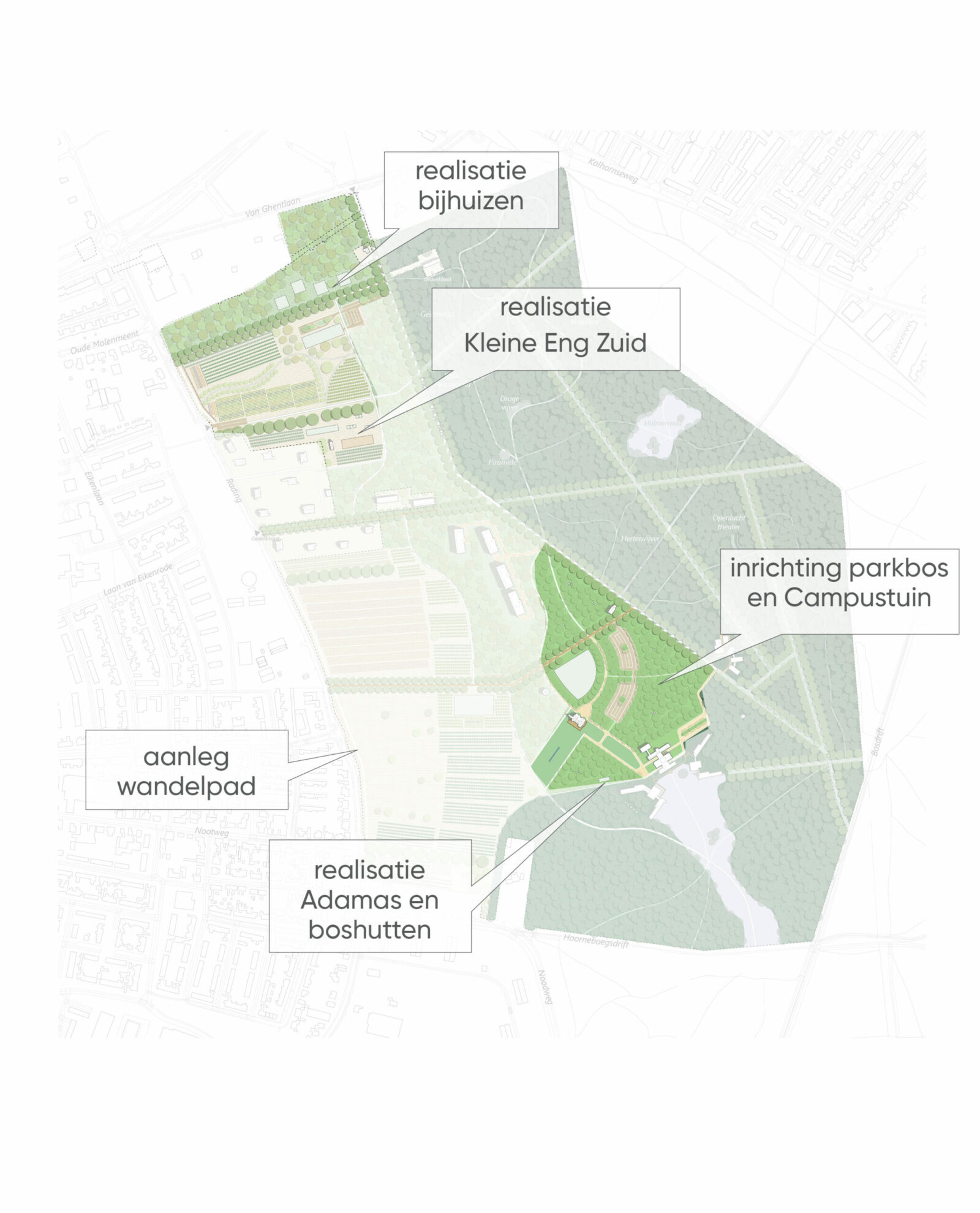 Vanaf 2023 gaan we verder met het realiseren van de Campus, naargelang de behoefte van de gebruikers en wordt de mogelijk de Boslaan versmald.